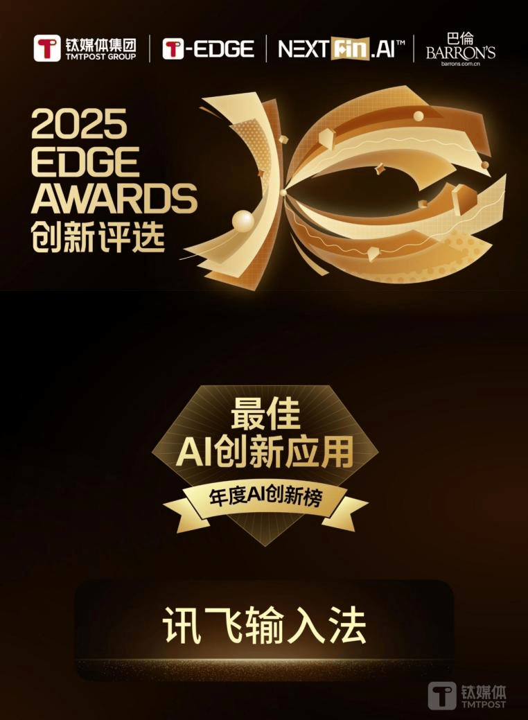在钛媒体举办的2025 EDGE AWARDS全球创新评选中,讯飞输入法凭借在大模型输入法领域的卓越表现,成功入选年度AI创新榜并斩获“最佳AI创新应用”奖项。这一殊荣不仅是对其技术实力的认可,更彰显了其在推动输入法行业变革中的引领作用。