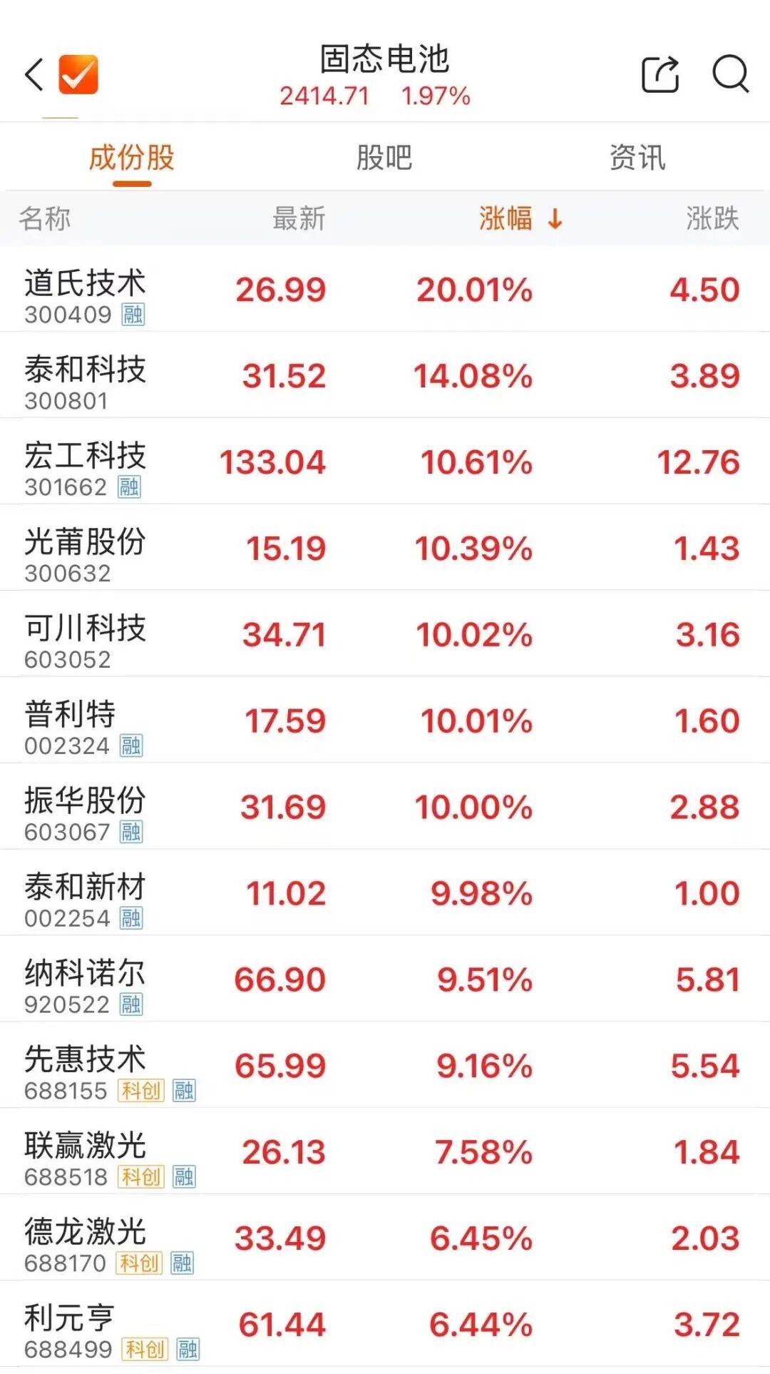 A股固态电池板块在午后交易时段展现出强劲的上涨势头,泰和科技、宏工科技以及光莆股份的股价涨幅均超过10%,同时,联赢激光、德龙激光、利元亨等公司也紧随其后,股价纷纷上扬。