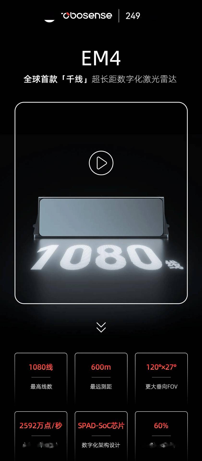 回顾2025年初,速腾聚创推出的EM4激光雷达曾引发广泛关注。作为全球首款1080线激光雷达,EM4具备最远600米的测距能力,垂向视场角达到120°×27°,点频高达2592万点/秒。这些参数使得EM4能够清晰探测到600米内的白色车辆、300米内的交通锥桶以及180米内的轮胎,从而显著提升车辆在紧急情况下的避让或刹停能力。