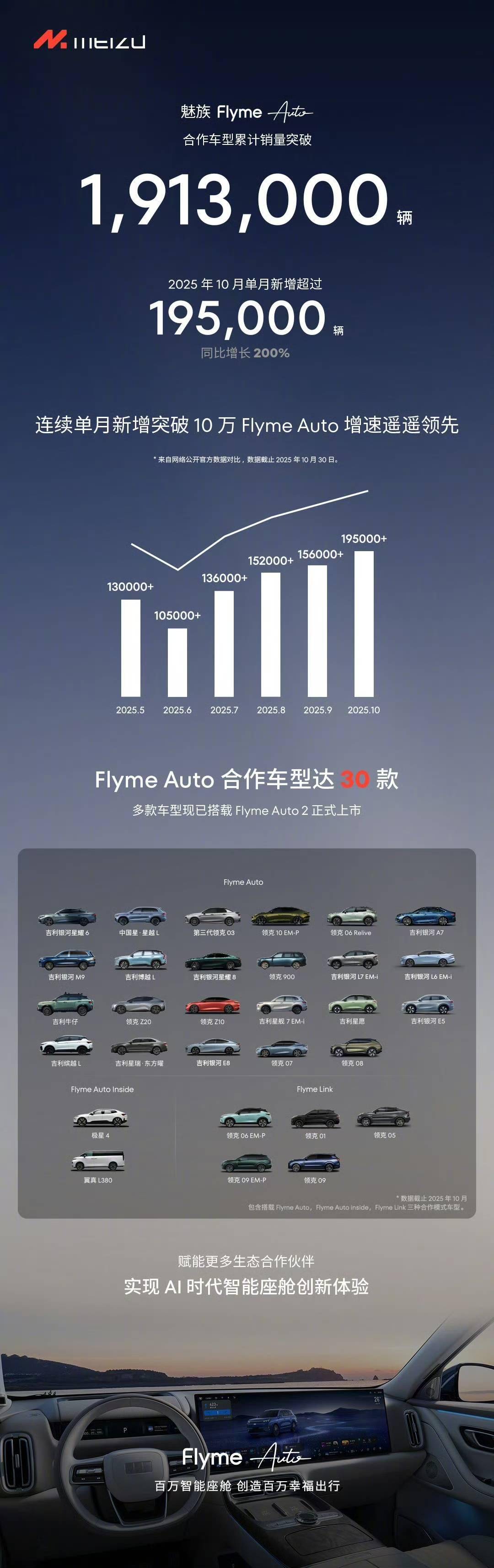 魅族官方近日公布了其Flyme Auto合作车型的最新销售数据,引发市场广泛关注。数据显示,10月份单月销量突破19.5万辆,同比增幅高达200%,且已连续数月保持单月新增销量超10万辆的强劲势头。