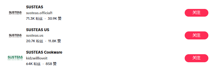 SUSTEAS品牌在海外市场的成功,离不开其对TikTok平台的深度运营。自入驻TikTok实现爆发后,该品牌便将这一平台作为核心运营渠道之一,在自营账号和达人推广营销方面都投入了大量精力。目前,可搜寻到的品牌账号共有3个,分别关联其旗下的不同TikTok小店。