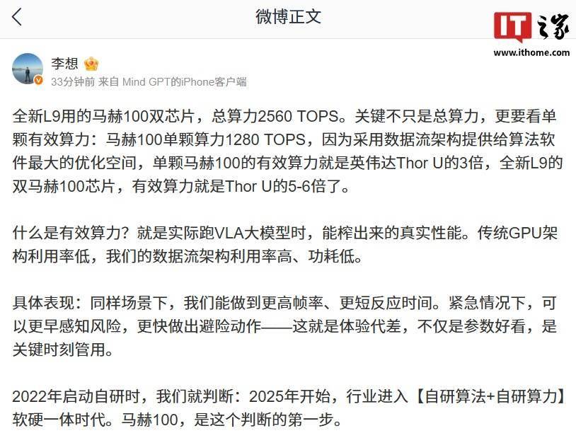 理想汽车CEO李想近日在社交平台发文,详细介绍了全新理想L9搭载的马赫100双芯片技术。这款芯片单颗算力达1280 TOPS,总算力高达2560 TOPS,但其核心优势在于数据流架构带来的高效利用率。据李想透露,单颗马赫100的有效算力是英伟达Thor U的3倍,而双芯片组合后的有效算力更是达到Thor U的5至6倍。