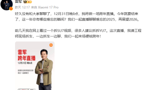 雷军因感冒严重宣布跨年直播改期 1月3日晚将携工程师现场拆小米YU7