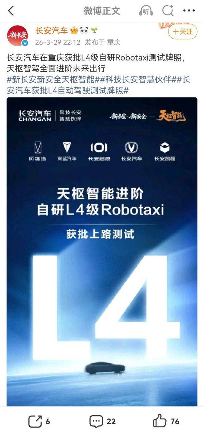 长安汽车近日宣布,其自主研发的L4级Robotaxi项目取得重大进展,在重庆成功获得高阶自动驾驶测试牌照。这一突破标志着重庆本土车企在智能驾驶领域实现全栈技术自主可控,为无人驾驶商业化落地按下加速键。