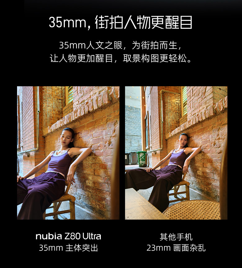 影像创作方面,努比亚Z80 Ultra堪称“街拍机皇”。其搭载的Neovision泰山AI影像5.0系统,以35mm人文主摄为核心,5000万像素搭配1/1.3英寸大底与f/1.7大光圈,让人物主体突出,细节清晰可辨。实体拍照键设计实现一键街拍,无需解锁即可定格瞬间美好,配合AI疾速运动抓拍技术,高速移动的物体也能清晰捕捉无残影。全焦段覆盖更是一大亮点,18mm超广角主摄拓展拍摄视野,6400万像素潜望长焦支持15cm微距拍摄与AI多帧超分技术,远处风景也能纤毫毕现。更有丰富胶片滤镜与AI灵感调色功能,让街拍氛围感拉满,逆光、暗光场景下也能拍出质感大片。