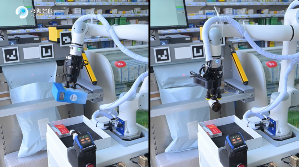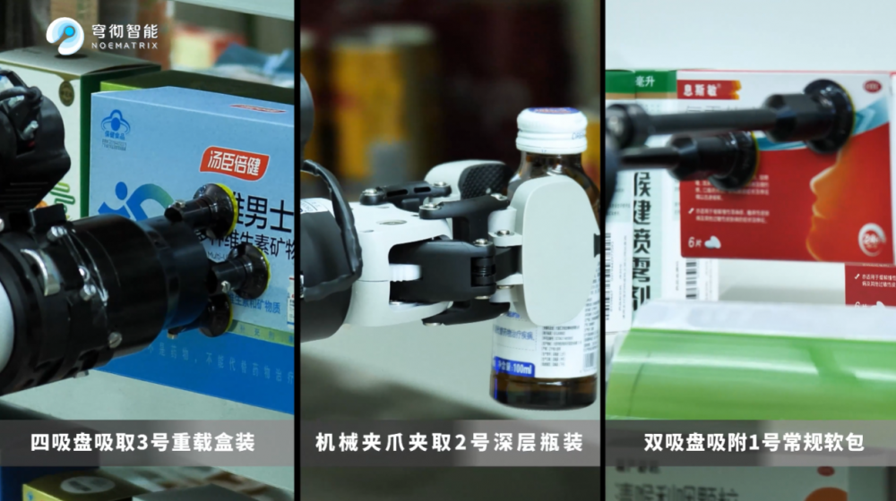 药房的复杂性,决定了智能方案不能靠“单一能力”取胜。实际运营中,系统需应对多种复杂场景:盒装、瓶装、袋装等多材质、多尺寸、多重量的药品,药品深层摆放、密集堆叠,以及易碎与非易碎物品的区分处理。穹彻通过多末端执行器(吸盘 / 夹爪)自动切换、动态路径规划、图像+条码多重校验,实现了对复杂SKU的稳定处理,适配药房真实运营需求。