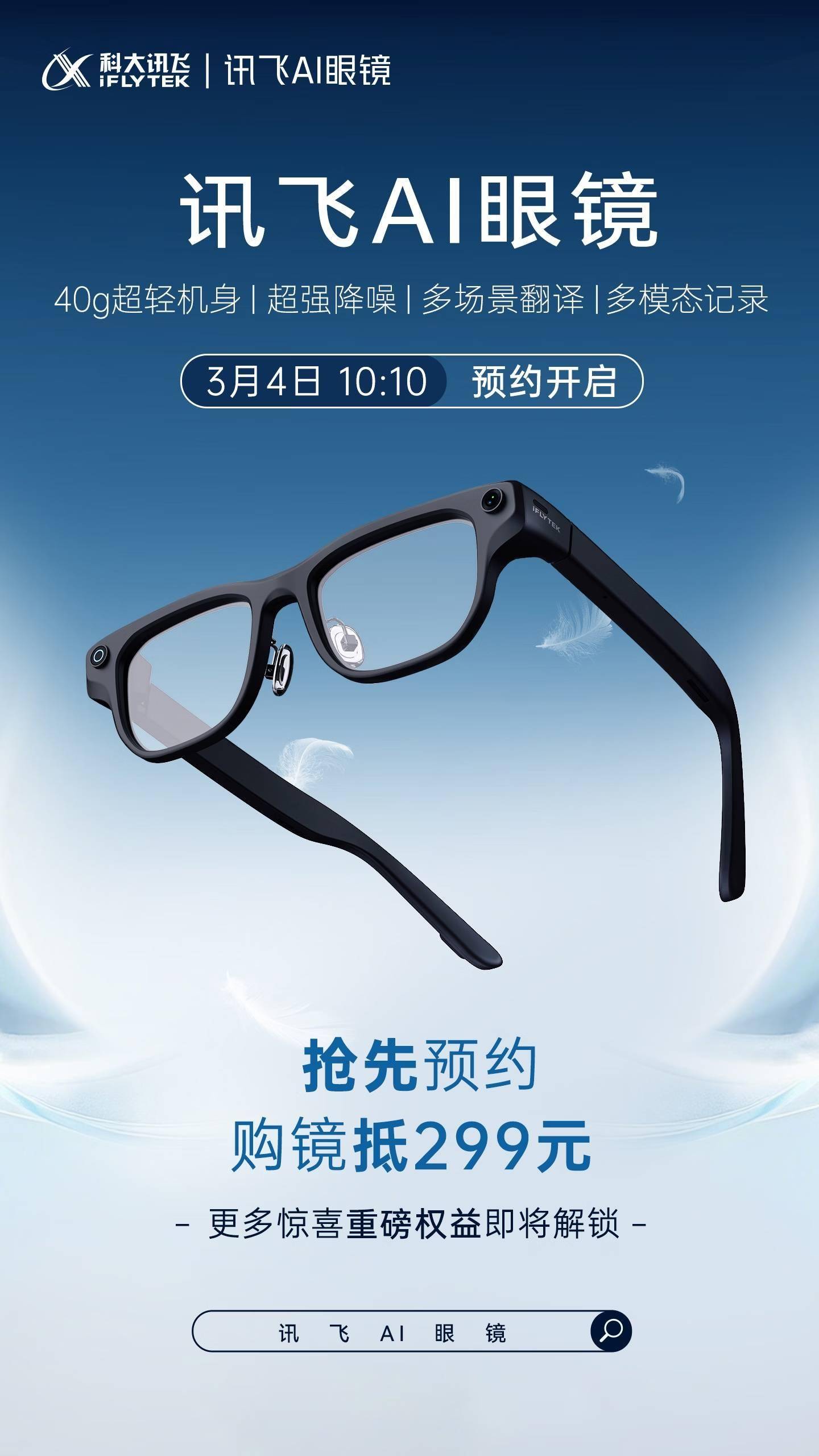 科大讯飞近日在世界移动通信大会上推出了一款创新产品——讯飞AI眼镜,这款专为跨语言交流设计的智能设备以仅40克的超轻重量引发关注。目前该产品已在京东平台开启预约通道,虽然具体售价和正式发售日期尚未公布,但官方透露提前预约可享受299元抵扣优惠。