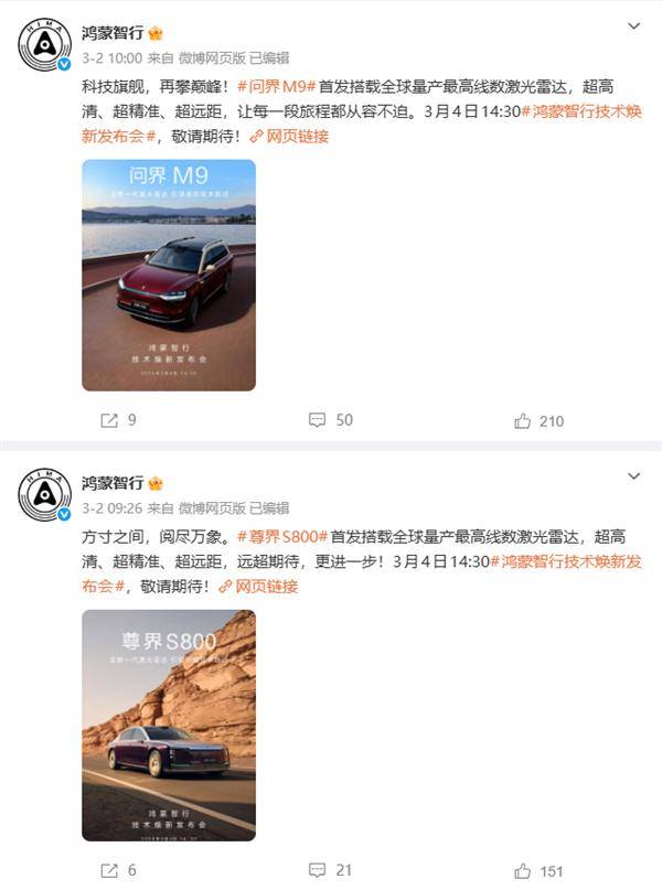 华为今日宣布,将在鸿蒙智行技术焕新发布会上正式推出新一代激光雷达,这一技术突破标志着智能驾驶感知领域进入全新发展阶段。问界M9与尊界S800两款车型成为首批搭载该技术的量产车型,凭借其超高清、超精准、超远距的感知能力,为高阶自动驾驶提供了关键硬件支撑。