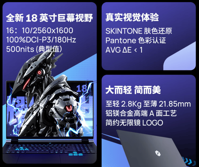 屏幕规格方面,18英寸面板拥有2560x1600分辨率与180Hz刷新率,亮度达500nits,覆盖100% DCI-P3色域并通过潘通认证,适合专业设计场景。接口配置包含3个USB-A、2个USB-C、Mini DP 2.1、HDMI 2.1及有线网卡接口,四扬声器系统与80Wh电池提供综合使用体验,整机重量2.8kg,提供两年质保服务。
