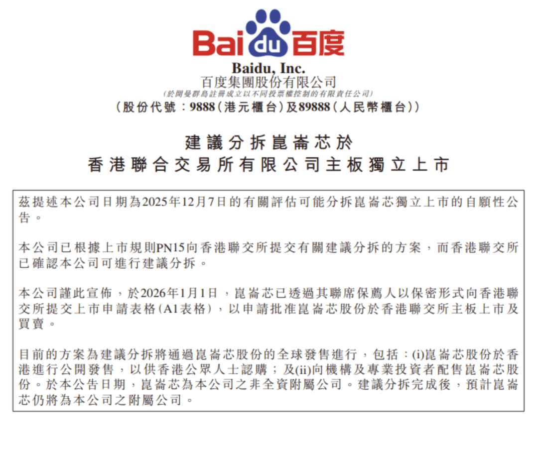 百度集团对外发布公告称,旗下昆仑芯已正式启动赴港上市进程。根据公告内容,昆仑芯通过其联席保荐人,以保密方式向香港联合交易所递交了A1上市申请表格,申请将其股份在香港联交所主板挂牌交易。