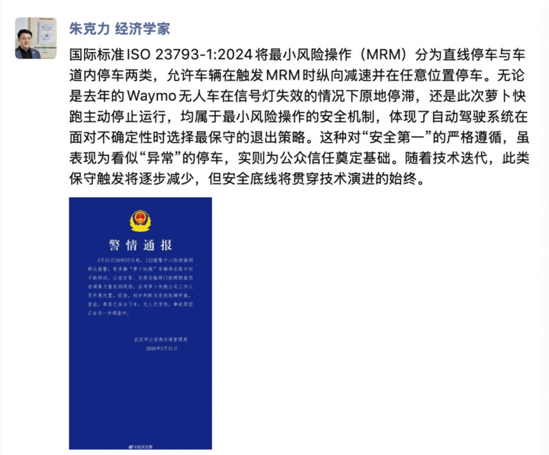 3月31日晚,武汉街头一辆“萝卜快跑”无人驾驶汽车突然平稳停下,双闪灯规律闪烁。这一场景被路人拍下后迅速在社交平台引发热议,有人戏称“科幻片成真了”,也有人质疑技术可靠性。无独有偶,数月前美国旧金山街头也出现过类似场景——Waymo无人车在无事故情况下主动驻停。两次事件背后,折射出公众对自动驾驶技术安全性的复杂认知。